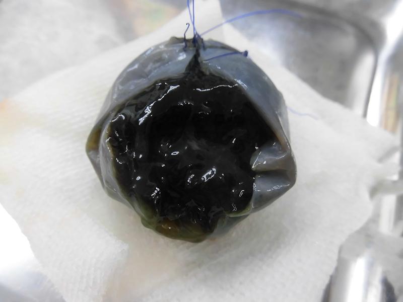 | 手術経過 | 胆嚢の病理検査の結果“壊死性胆嚢炎”という診断検査でした。これは胆嚢壁が粘液を異常に産生することにより、胆嚢が著しく腫大し、胆嚢周囲への血流が阻害されたことによるものと考えられています。放置しておくと、胆嚢破裂を起こし、胆汁性腹膜炎で死亡していたかもしれません。胆汁検査の結果、胆汁中に細菌感染はなく、肝生検の結果も特に異常なしとのことでした。術後、とても元気になり、食欲も出てきたとのことでした。 |