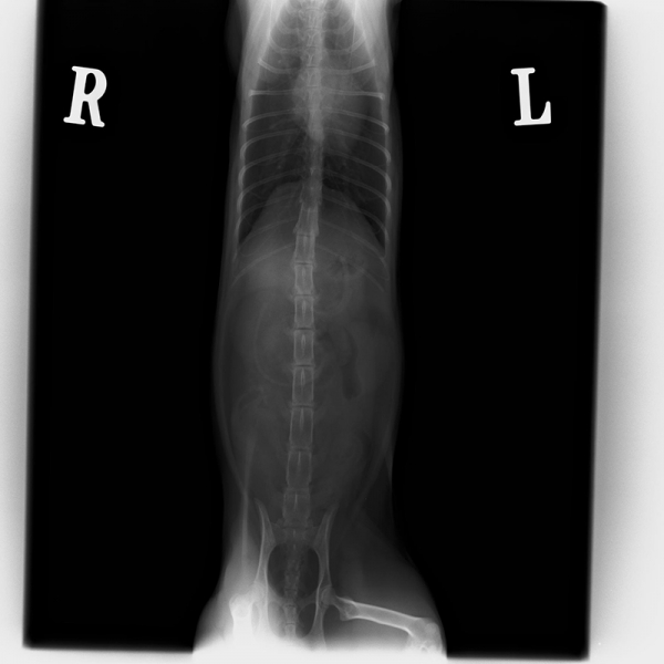 | 症状 | 右会陰部が腫大しているとのことで来院されました(図1)。お尻に手を入れて検査したところ、直腸を支えるお尻の周りの筋肉が著しく菲薄化し、筋肉と筋肉の間から膀胱と直腸が脱出している会陰ヘルニアという病気でした。レントゲン検査では膀胱が腹腔内から脱出していることが分かりました(図2)。注腸造影では直腸の湾曲や拡張は認められませんでした(図3)。 |
