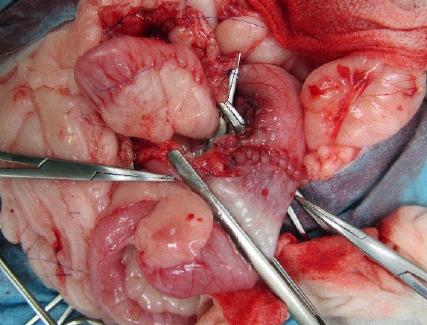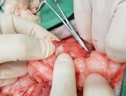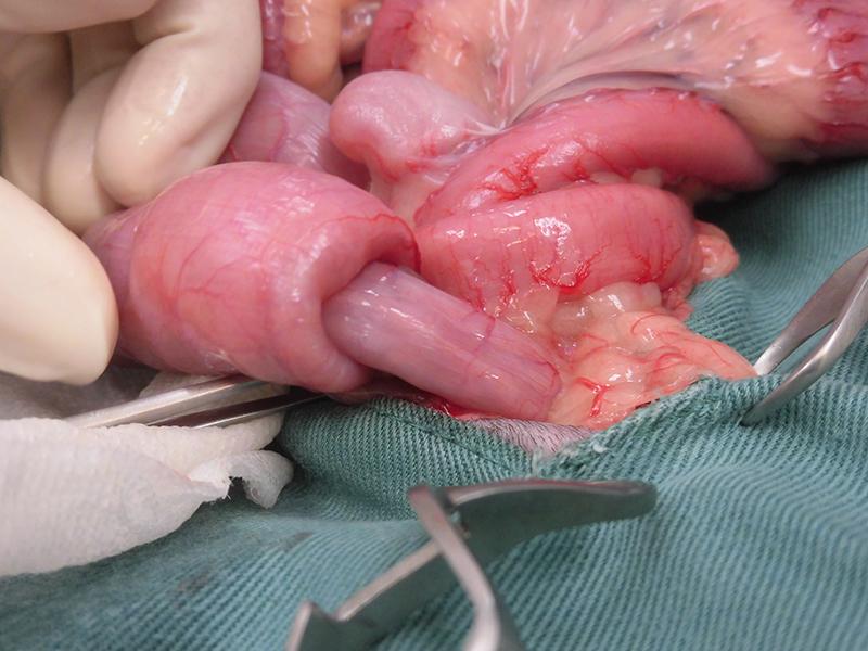 | 手術方法 | 貧血があったため、術前に輸血を行い、手術中も輸血を行いました。全身麻酔下でお腹を開けたところ、横行結腸に腸重積があり、その遠位に硬くなったしこりを認めました(図3)。腸重積を解除し(図4)、腫瘍と思われる領域の腸を切除し、端・端吻合を行いました(図5~6)。腸のつなぎ目には大網と呼ばれる膜を貼り付け、頑丈にしました。 |