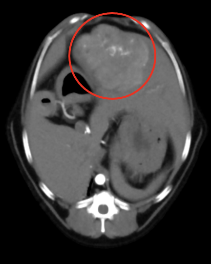 | 症状 | 健康診断の血液検査で肝臓の数値が高かった為、肝臓の超音波検査を行なったところ、肝臓に腫瘍が見つかりました。CT検査の結果、肝臓の内側左葉に出来た腫瘍であることが分かりました。 |