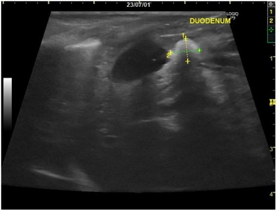 | 症状 | 元気・食欲低下で来院されました。黄疸が認められ腹部触診で上腹部に激しい痛みが認められました。血液検査の結果、肝酵素の著しい増加が認められ、レントゲン検査において肝内胆管と総胆管内に結石が認められました。超音波検査では、総胆管の著しい拡張と十二指腸開口部に結石が確認されたことから、結石による総胆管閉塞と診断しました。 |