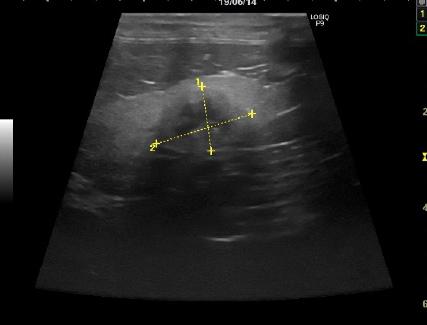 | 症状 | 3日前より食欲不振と嘔吐、下痢を主訴に来院されました。腹部触診にてお腹のなかにしこりが触知されました。エコー検査を行ったところ、左上腹部に腎臓腫瘍が認められました(図1)。オーナー様とご相談の上、摘出することにしました。 |