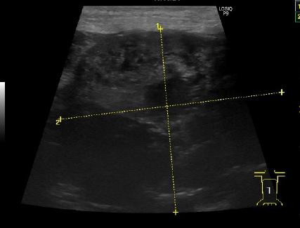 | 症状 | 昨日よりぐったりしており、食欲もなく呼吸が速く血便が見られるとのことで来院されました。触診を行ったところ、お腹のなかにしこりが触知され、超音波検査を行ったところ腸重積(図1)と消化管壁の肥厚(図2)が認められました。また、貧血や心臓の弁膜症などがあることも分かりました。超音波ガイド下で腸の腫瘍に針を刺して、細胞の検査を行いましたが、明らかな情報は得られませんでした。オーナー様とよく相談した上、試験開腹を行うことになりました。 |